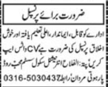 Al Falah International School System has announced a new career opportunity through the Daily Mashriq Newspaper dated 8 September 2025. The school, located in Par Hoti, Mardan, is looking to hire a Principal. Candidates holding a Master’s degree such as MA or M.Sc are eligible to apply. This is a great chance for qualified and experienced individuals who wish to work in a leadership role within the education sector.