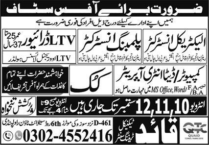 Quaid Technical Training Center, located in Satellite Town (6th Road), Rawalpindi, is inviting applications for various positions as advertised in the Daily Express newspaper on September 10, 2025. Available vacancies include Electrical Instructor, Plumbing Instructor, Computer Operator, Data Entry Operator, LTV Driver, Driver, and Cook.