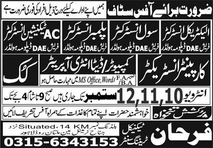 Farhan Technical Training Center, located on Multan Road, Lahore, is currently hiring for multiple positions, as advertised in the Daily Express on September 10, 2025. The available roles include Data Entry Operator, Computer Operator, AC Technician Instructor, Civil Instructor, Carpenter Instructor, Cook, Electrical Instructor, and Plumber Instructor. Candidates with educational qualifications such as Middle, Matric, Intermediate, DAE, BA, or Bachelor’s degree are eligible to apply.
