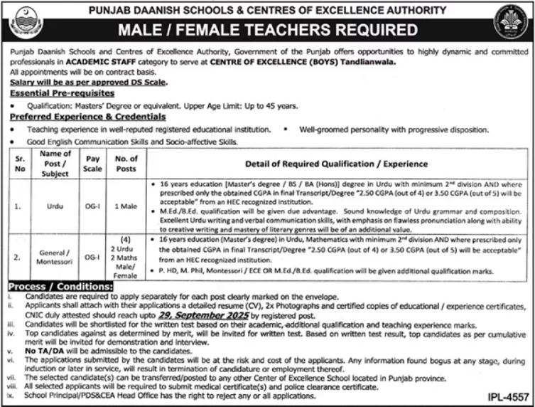 Punjab Daanish Schools & Center of Excellence Authority has opened new teaching vacancies in Tandlianwala, Punjab, as announced in the Daily Dunya Newspaper on 11 September 2025. This recruitment drive is a great opportunity for education professionals who want to work in a respected government school system. The posts include Female Teacher, Urdu Teacher, Montessori Teacher, Male Teacher and Maths Teacher. Applicants holding Bachelor’s, Master’s or MS degrees in the relevant subjects will be preferred.