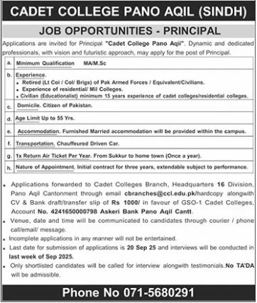 Cadet College Pano Aqil, situated in Sindh, Pakistan, is currently accepting applications for the position of Principal, as per the job advertisement published in the Daily The News on September 13, 2025. Candidates with qualifications such as MA or MSc will be preferred. This is a reputable government management opportunity for experienced education professionals. Interested applicants are encouraged to apply before the deadline of September 20, 2025, or as mentioned in the official ad. For complete details on eligibility criteria, application process, and instructions, visit teezjob.com and view the full job listing.
