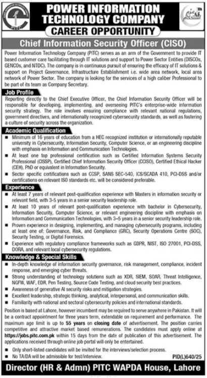 from qualified candidates for the position of Chief Information Security Officer, as announced in The News newspaper on 15 September 2025. Candidates holding Bachelor’s or Master’s degrees in relevant fields are eligible to apply for this prestigious government role. This is an excellent opportunity to work in a leading public sector organization specializing in IT solutions. The last date to apply is 29 September 2025, or as specified in the official advertisement. For complete job details, eligibility requirements, and application instructions, visit TeezJob.com. Stay connected with TeezJob.com for the latest government job updates across Pakistan.